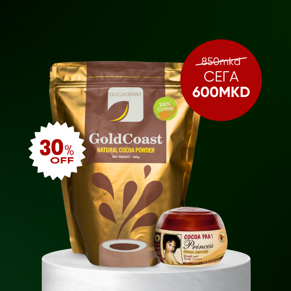 100% природен какао во прав (1 х 400гр): Чисто, богато какао во прав спакувано со антиоксиданси и есенцијални хранливи материи. Помага во борбата против слободните радикали, промовира здрава, сјајна кожа и го подобрува расположението. Совршен за правење здрава топла чоколада или додавање на смути и печива.